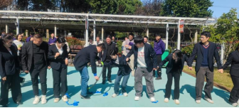 首個重磅項目——“十人九足一圈到底”協(xié)同賽,將賽事推向了第一個高潮。這是一個極其考驗團隊協(xié)調(diào)性與統(tǒng)一性的復(fù)合型項目,要求十名隊員不僅要用綁帶將相鄰的腿兩兩綁住,形成“十人九條腿”的奇特模式協(xié)同前行,還需在到達終點后共同協(xié)作,讓一個呼啦圈穿過所有人的身體,完成“一圈到底”。